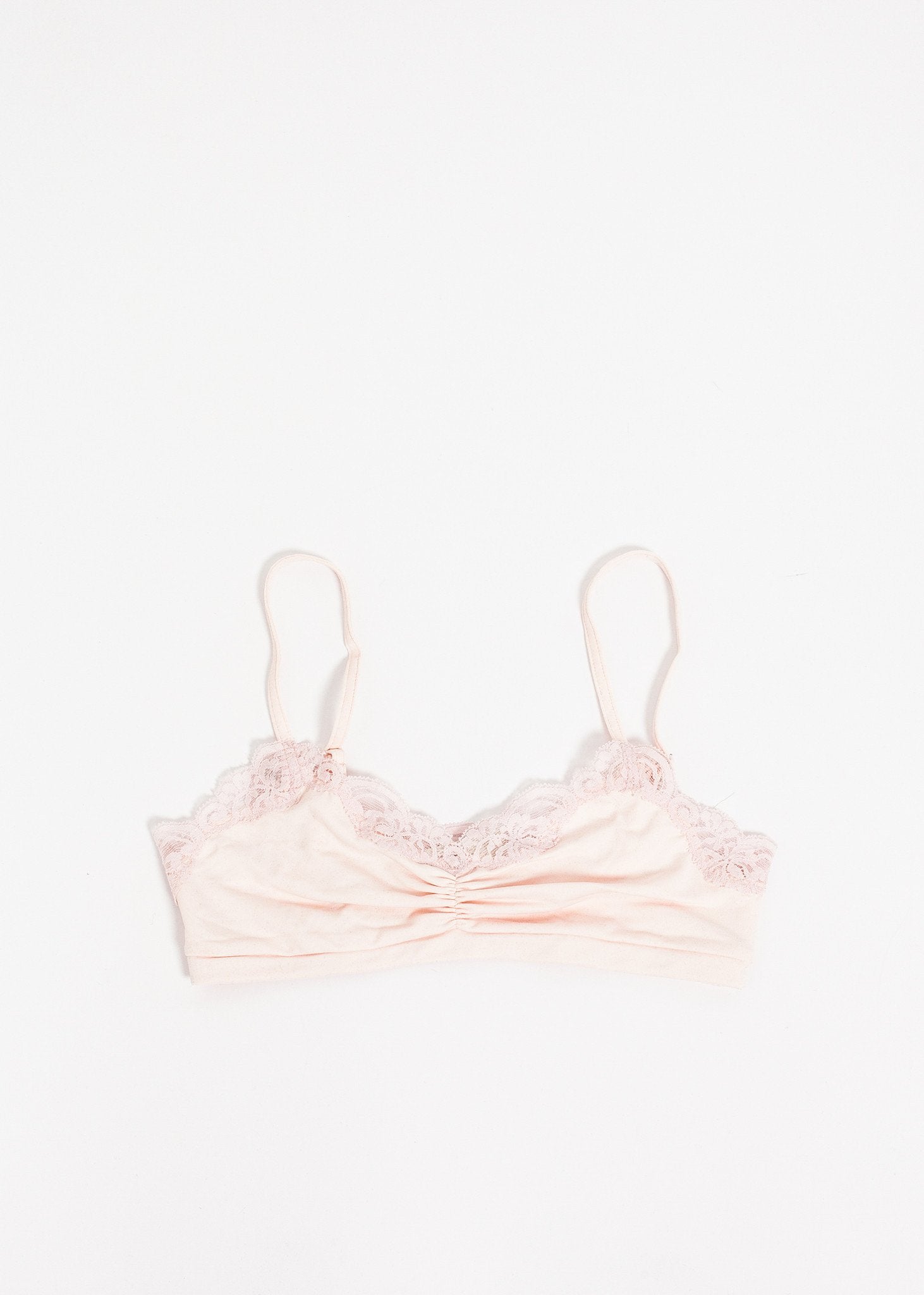 The Ruche Bra from Only Hearts offers a delicate fit for your everyday needs with a fun lace trim. Color Barely Pink. 90% Nylon, 10% Lycra. Made in U.S.A.